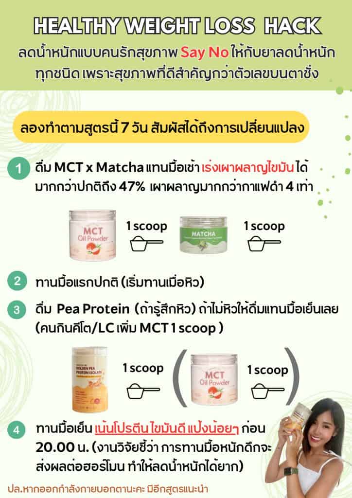 เวลารับประทาน ( สำหรับผู้ต้องการลดน้ำหนัก ) ทานแทนมื้ออาหาร ผสมกับ MCT Oil Powder วันละ 1 มื้อ