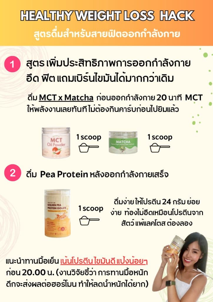 แนะนำดื่ม 1 scoop ผสมกับชา/กาแฟ/โกโก้/โปรตีนถั่วลันเตา ในมื้อเช้า จะสังเกตได้ว่าช่วยให้อิ่มทาน ทานมื้อเที่ยงได้น้อยลง (ควรลดการทานน้ำตาล/หวาน)